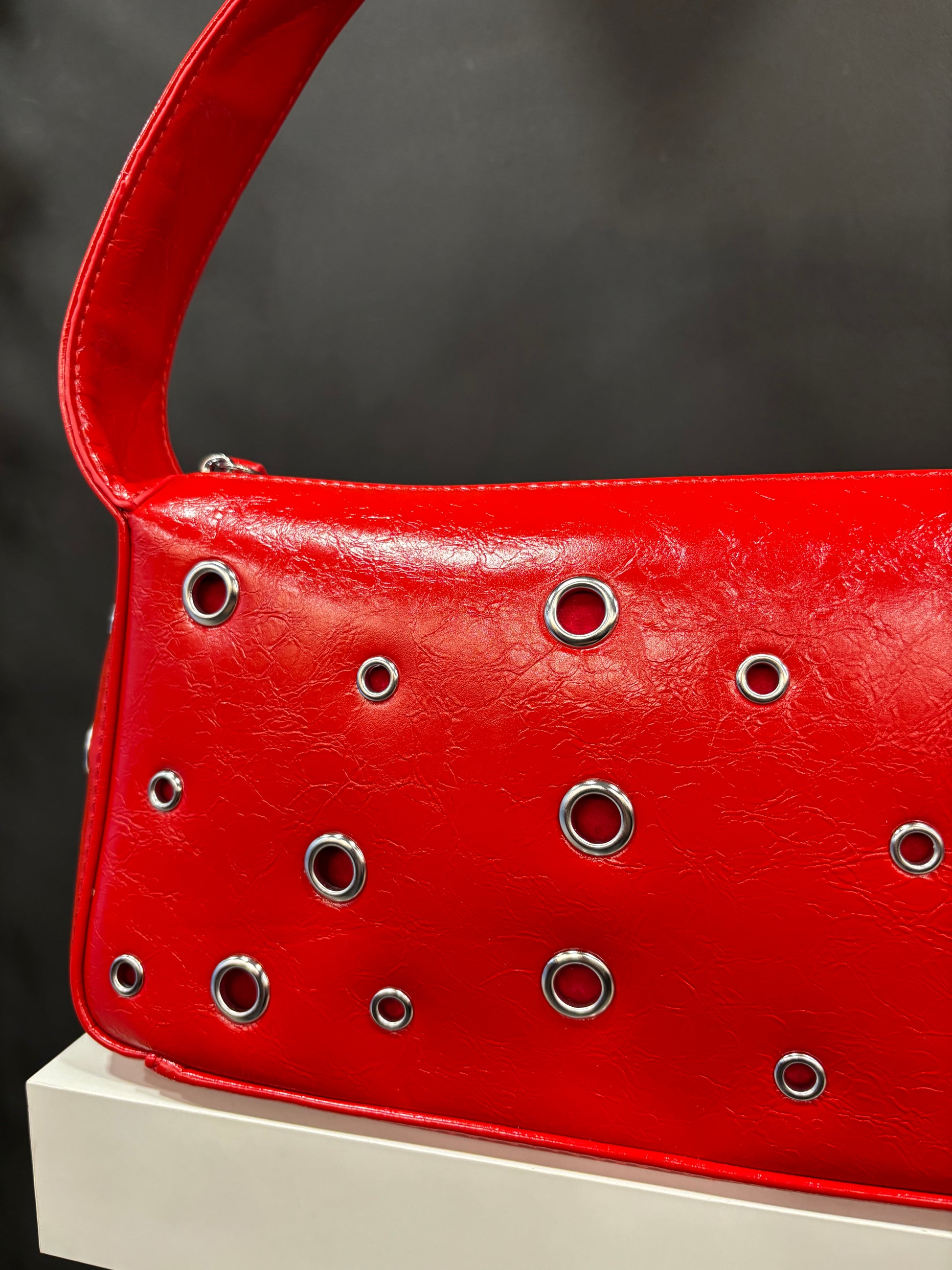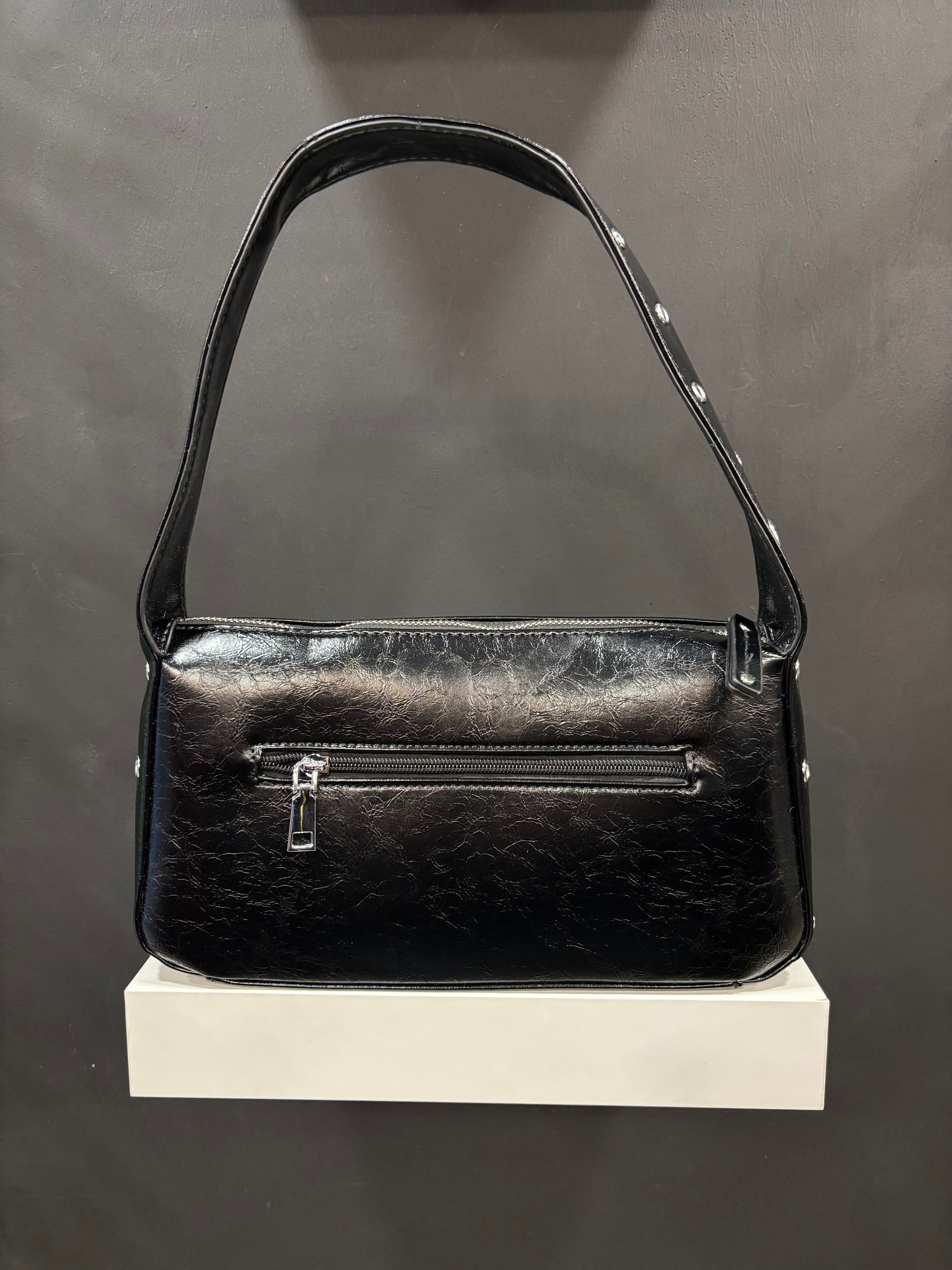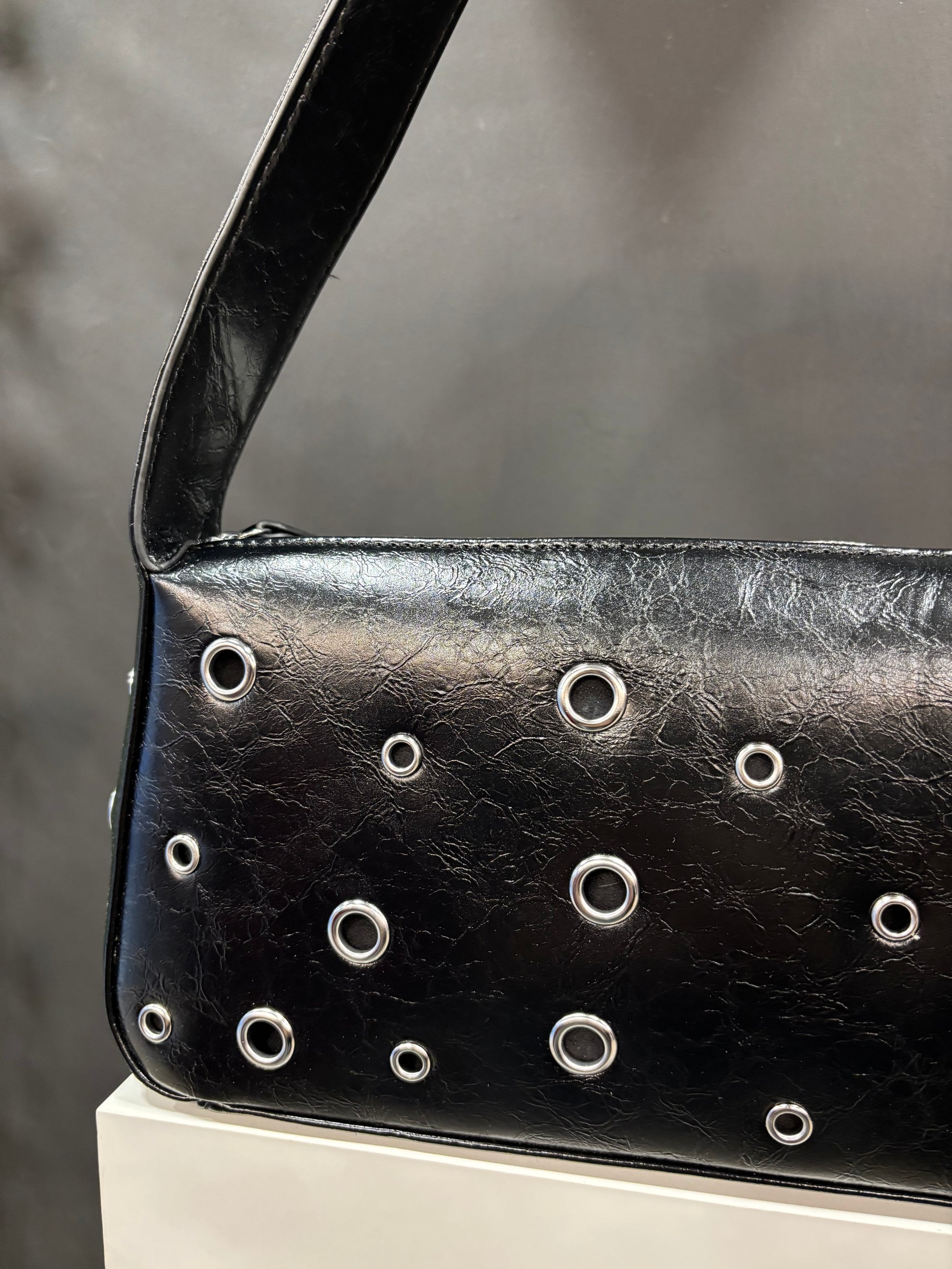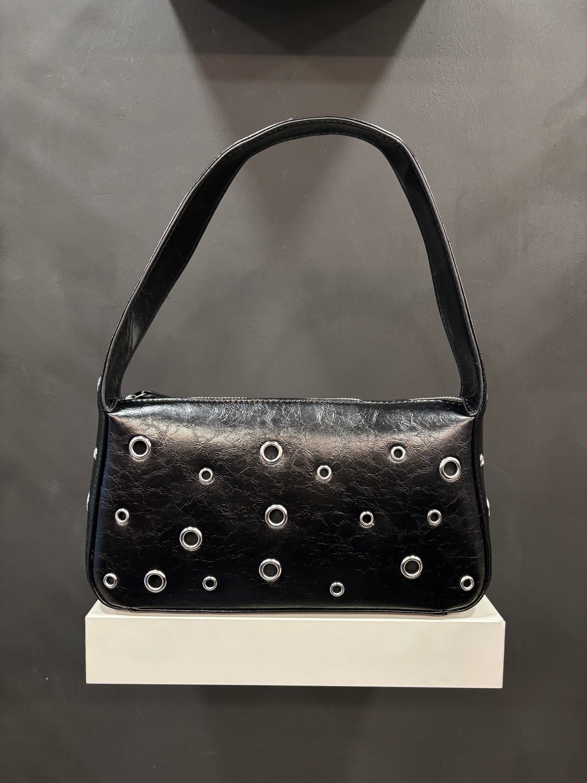 Bolso de hombro con asa corta y detalles de ojales en plateado.