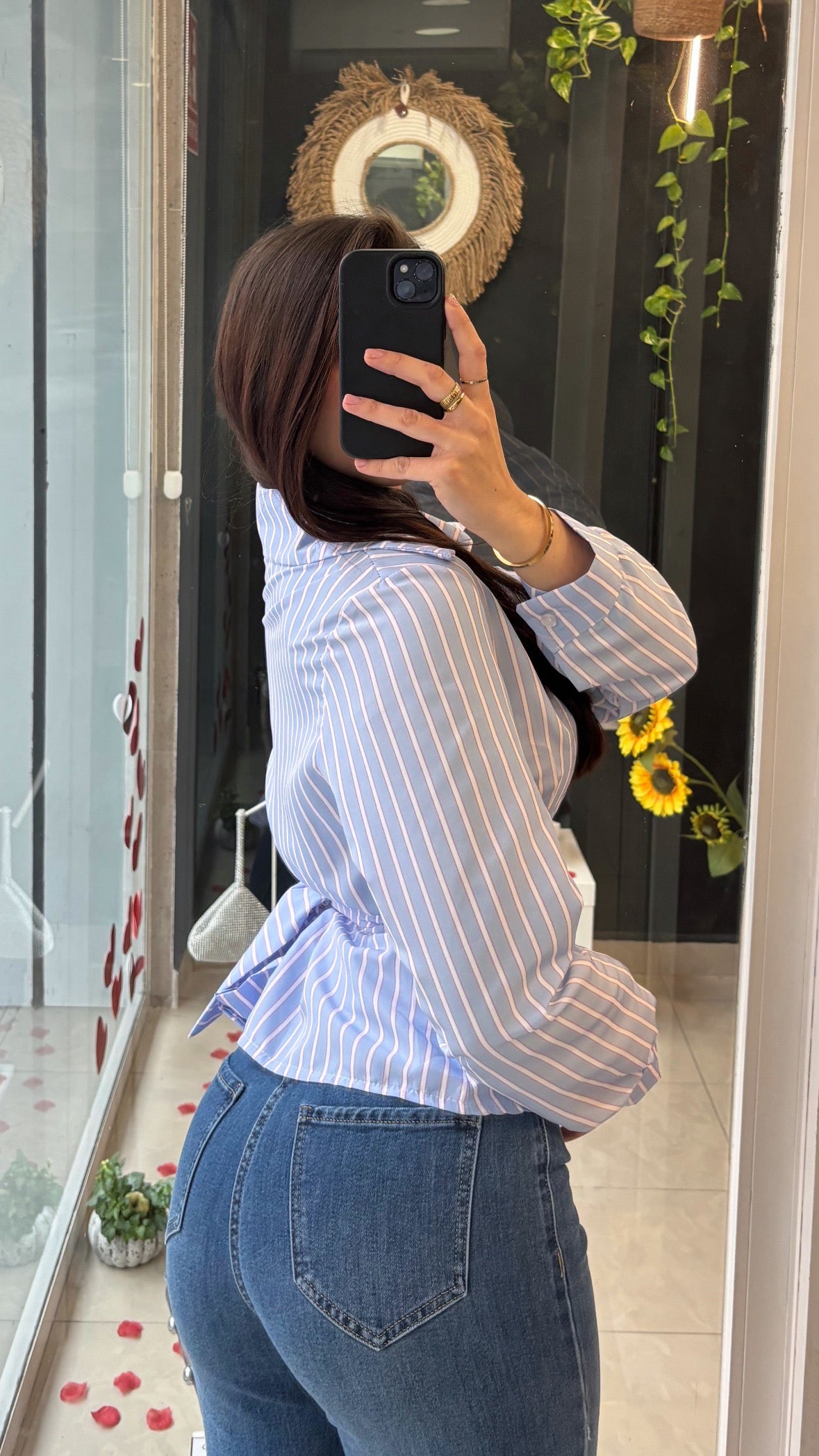 Camisa de mangas largas con estampado de líneas vestivales y detalle de lazo en la espalda.