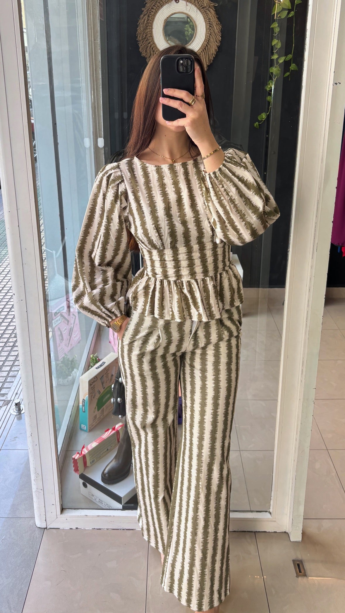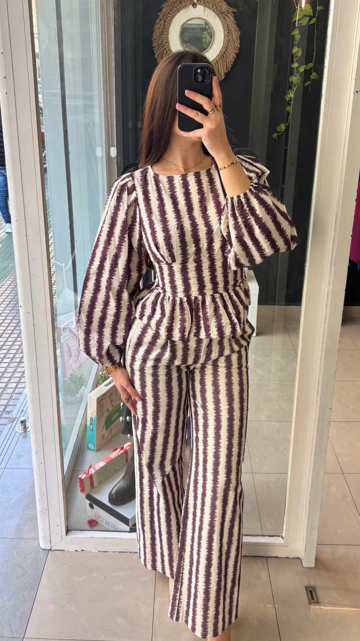 Conjunto dos piezas 100% algodón, compuesto por top y pantalón con estampado de líneas verticales.