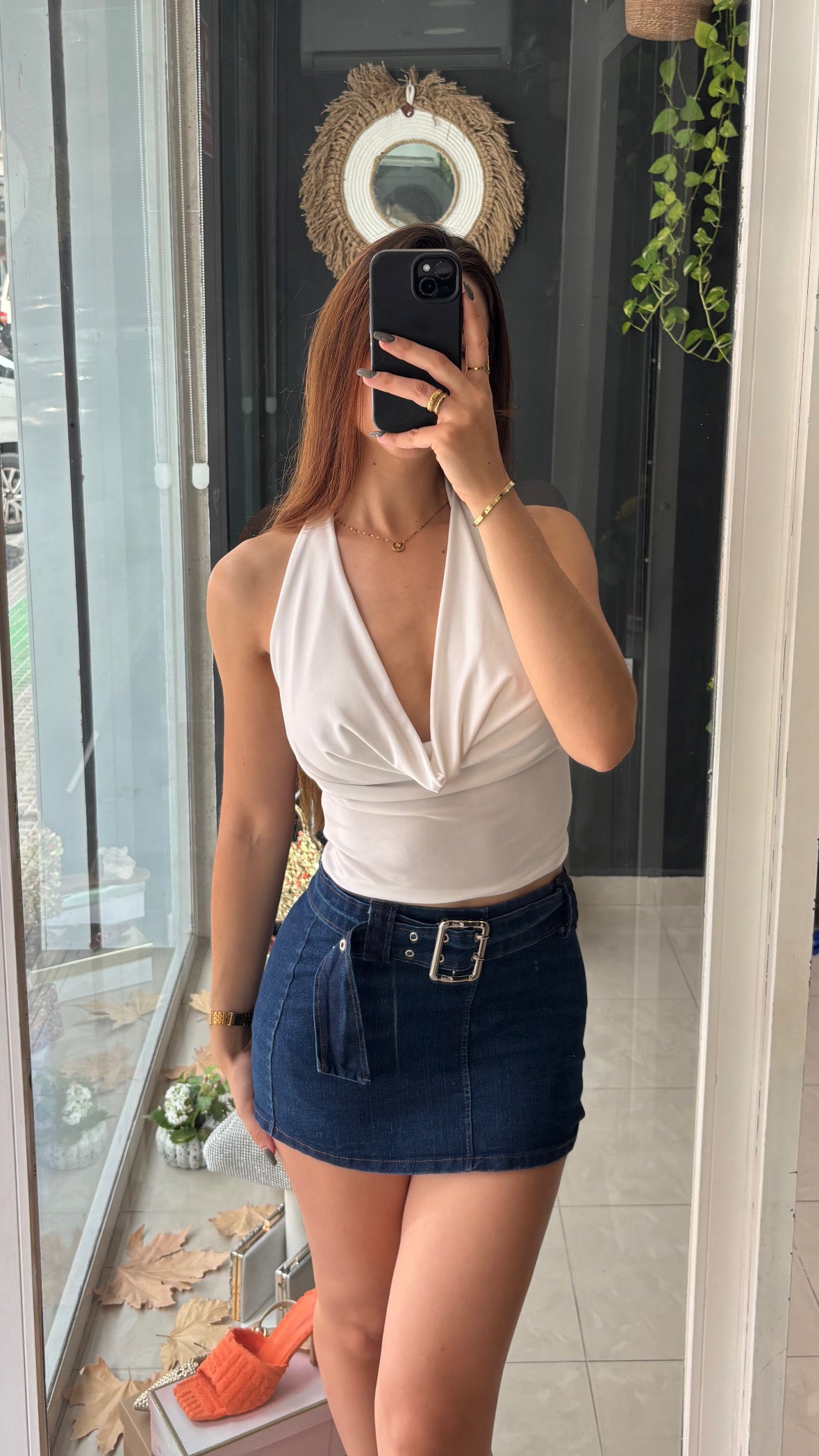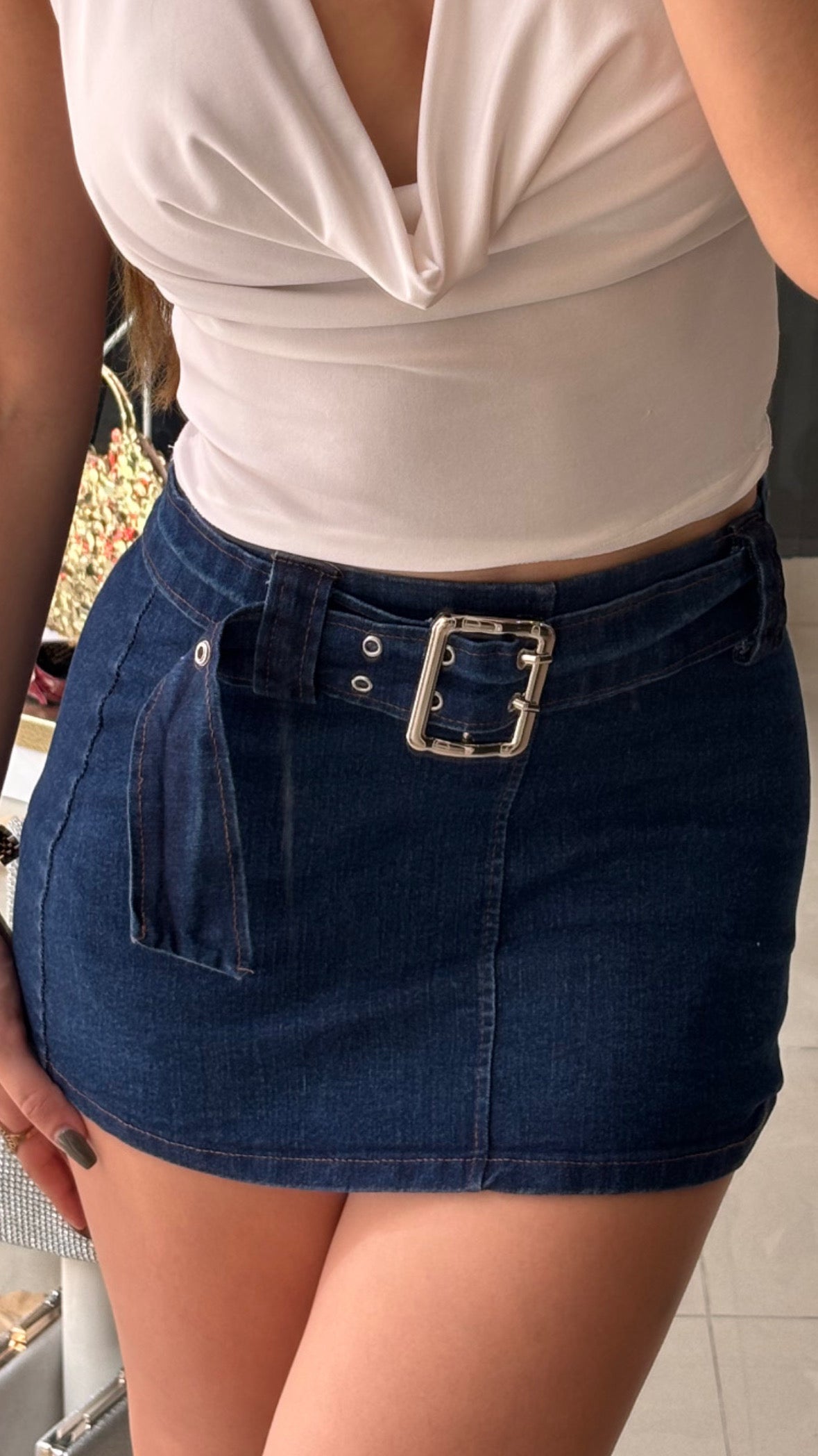 Minifalda pantalón de tiro bajo con tejido vaquero y cinturón.