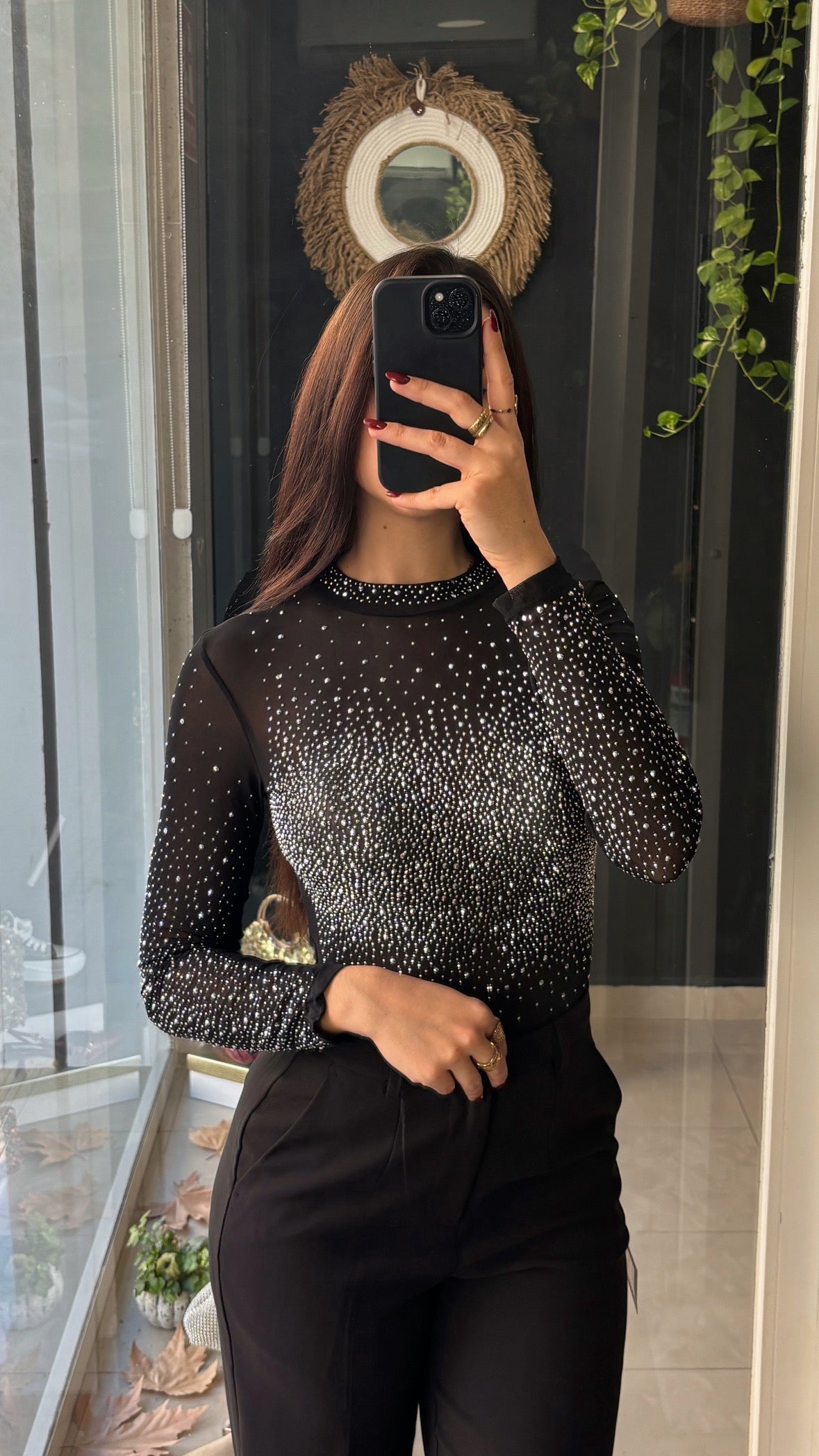 Body de mangas largas transparente con detalles de brillantes plateados.