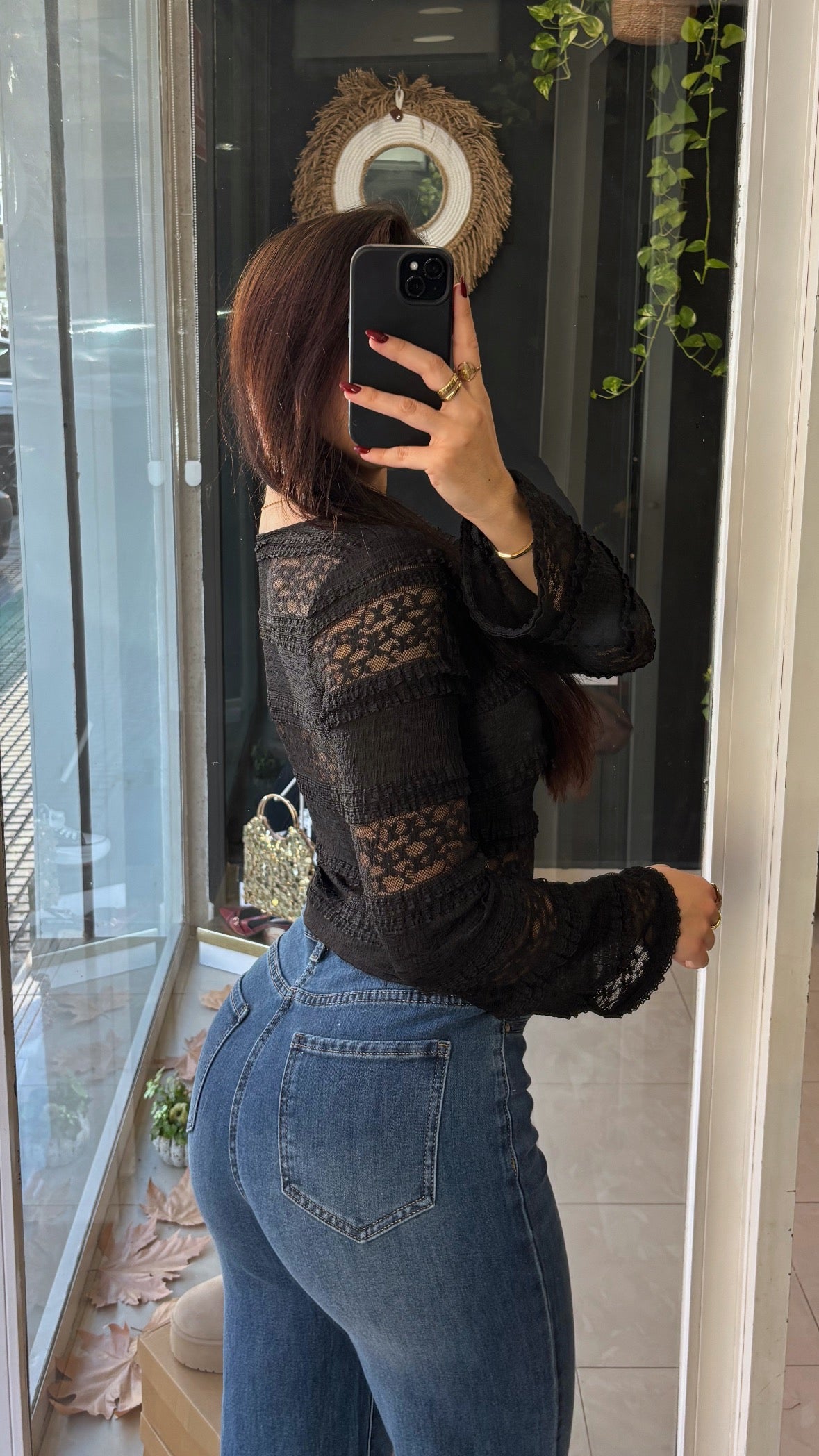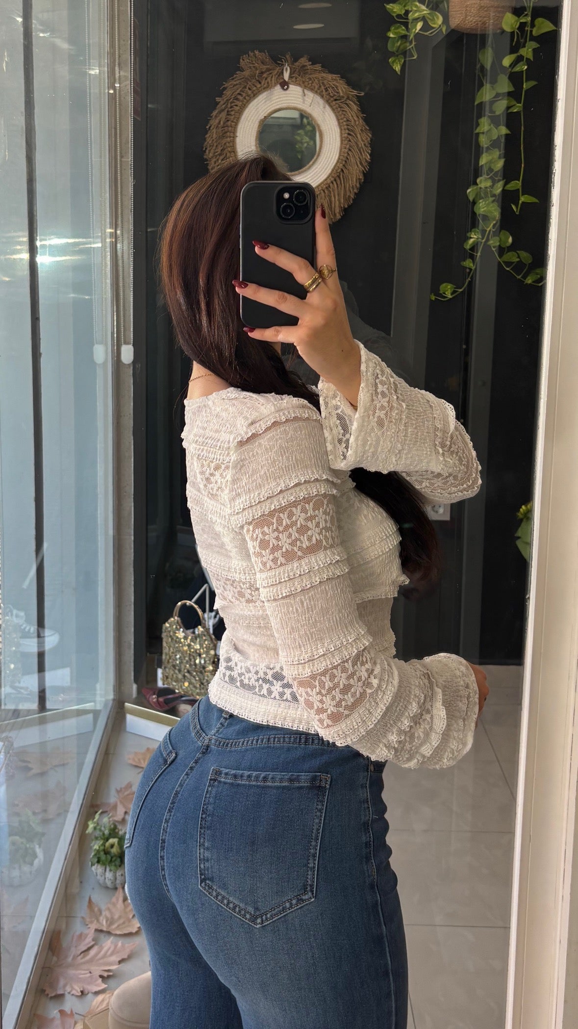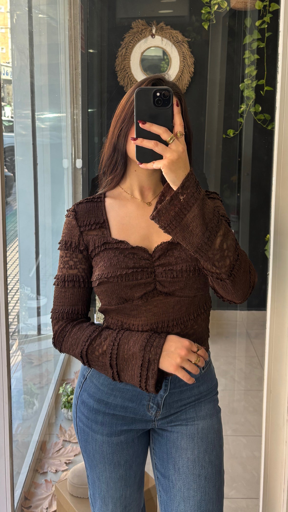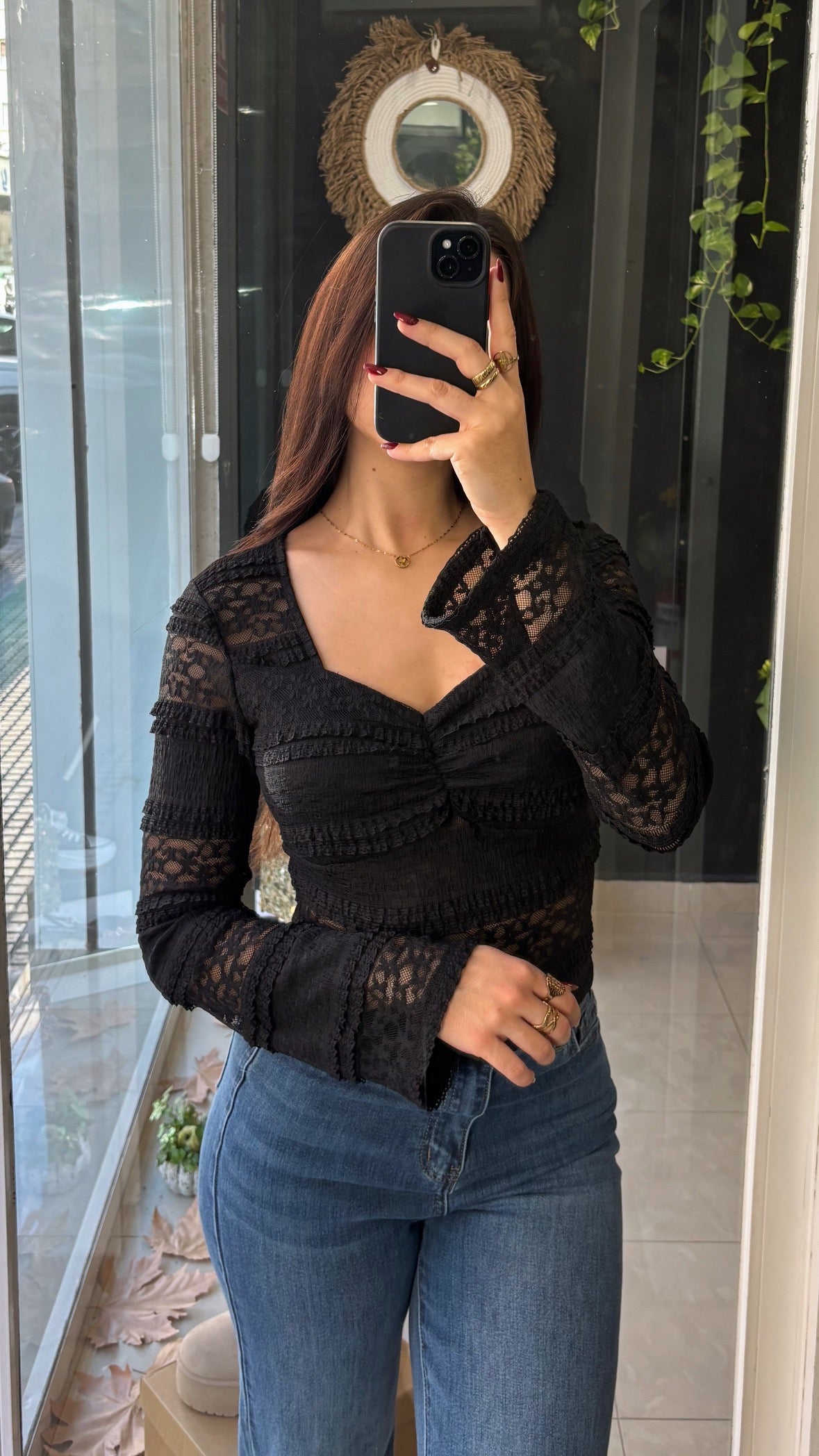 Top de mangas largas con escote y detalles de encaje y semitransparencias.