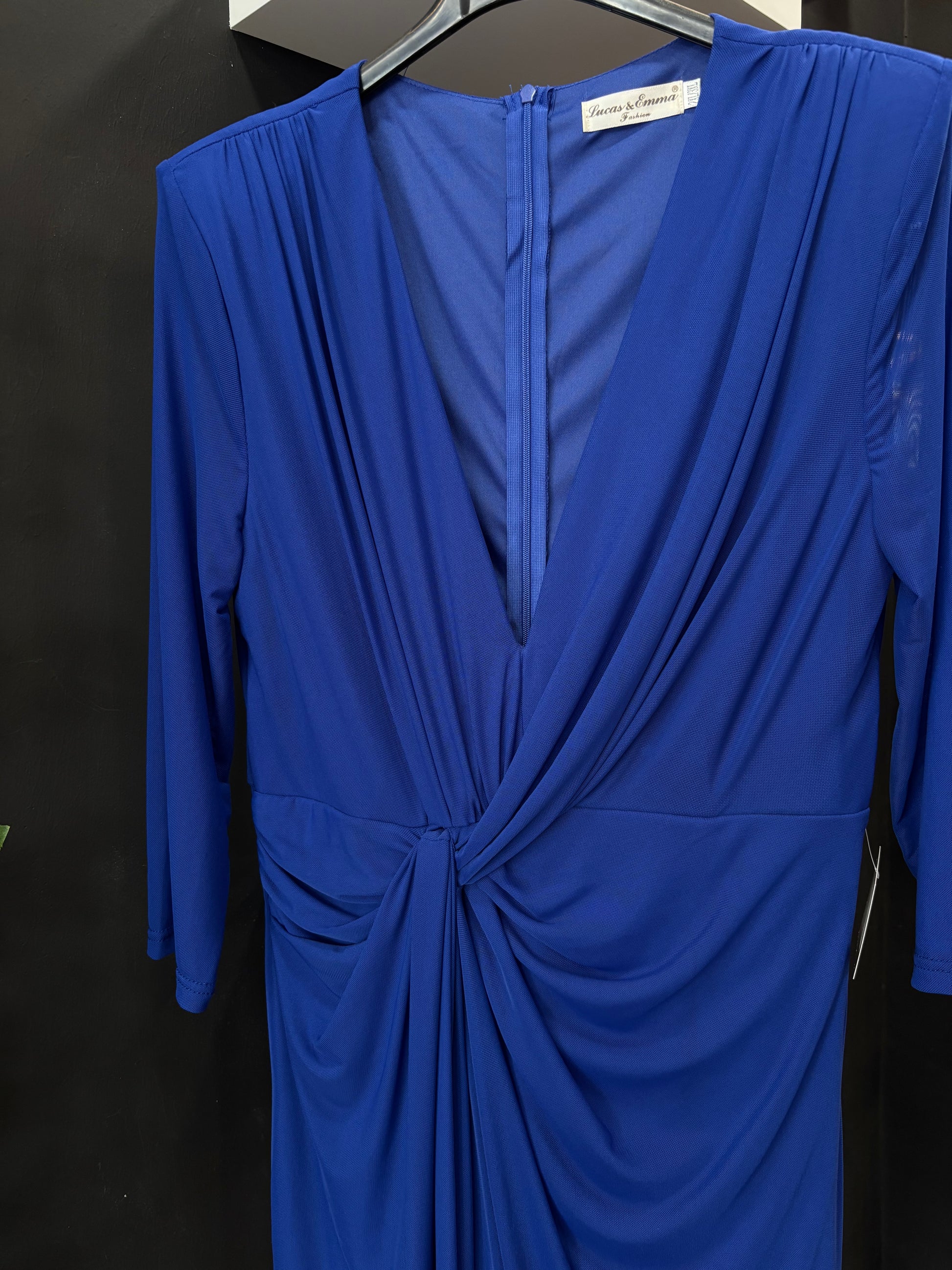 Vestido midi de evento con manga francesa, escote y detalles drapeados.