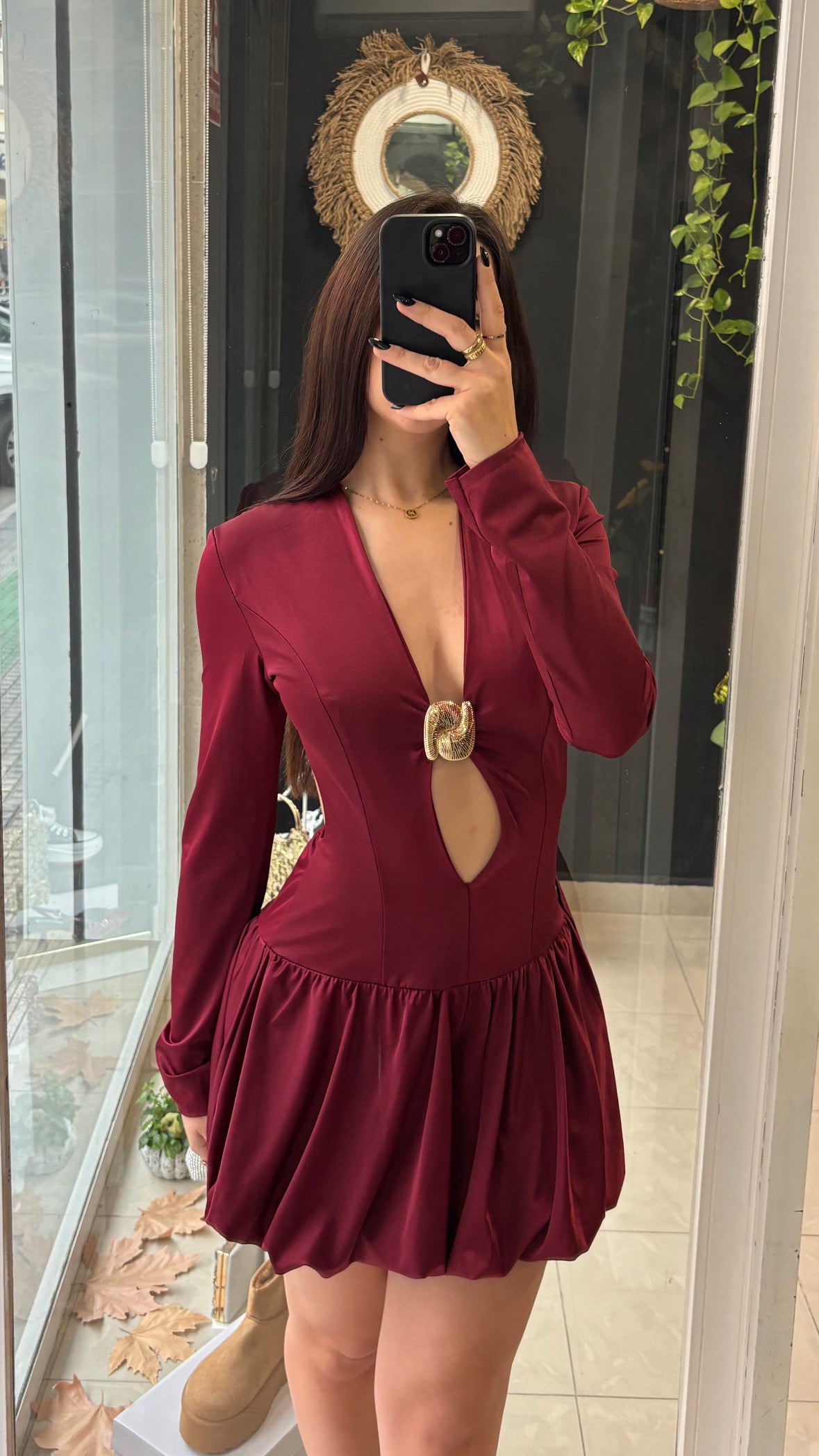 Vestido corto con mangas largas, escote pronunciado con detalle de hebilla dorada y falda de globo.