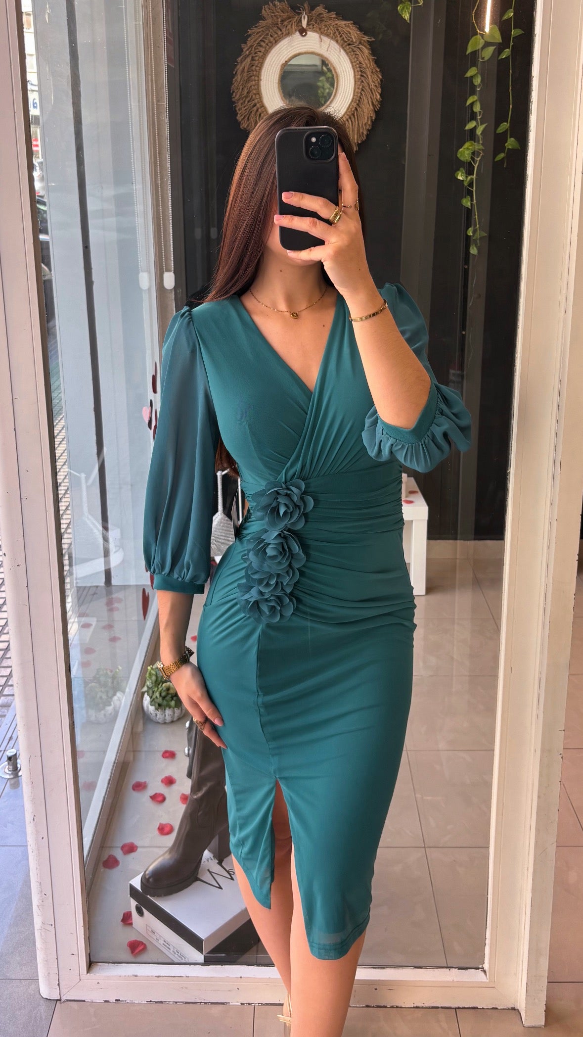 Vestido midi de evento con manga francesa, escote y detalles de flores.